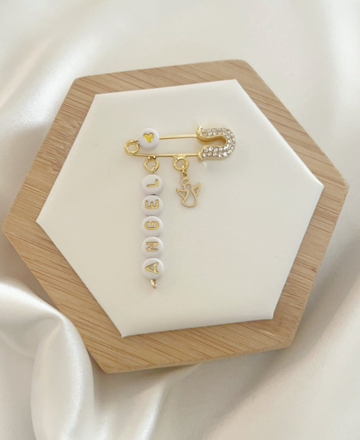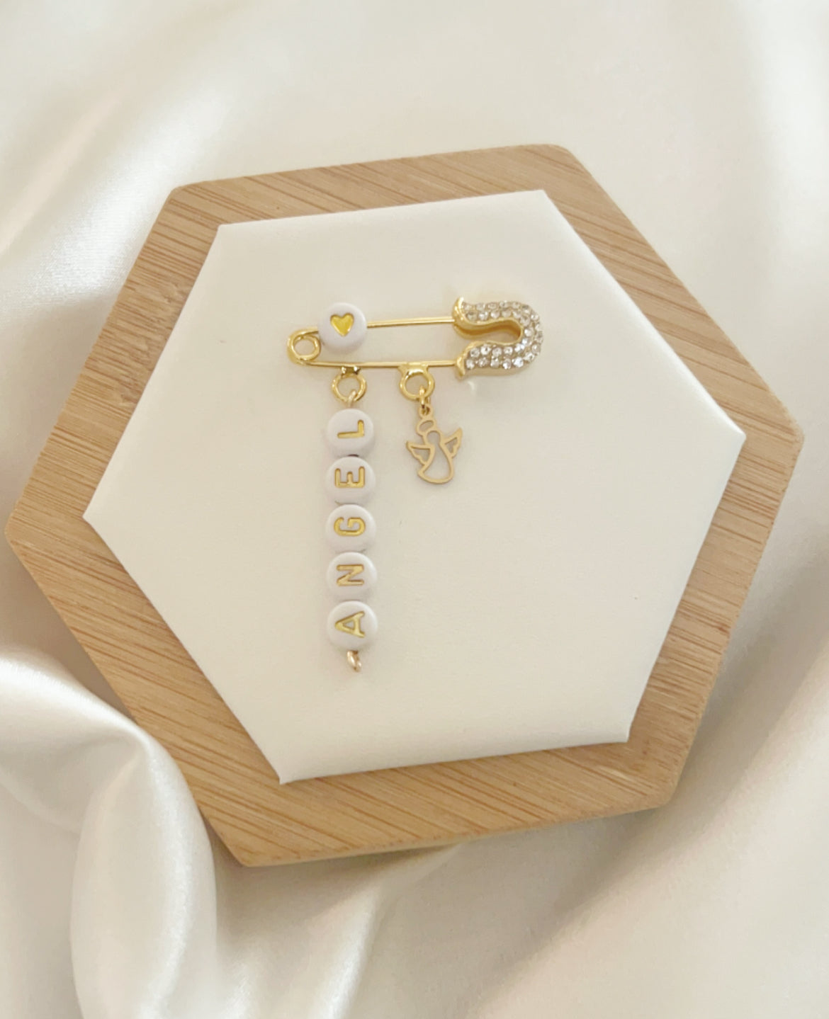 Created with love and reverence, the Angelé pin from our Angel Collection is a delicate tribute to the littlest souls who are forever cherished. This tiny, gold-plated pin glows with crystal-clear elegance, and features three gentle elements: a white and gold heart bead, a serene angel charm, and a beaded charm that lovingly spells out “A-N-G-E-L”, symbolizing purity, presence, and eternal love.