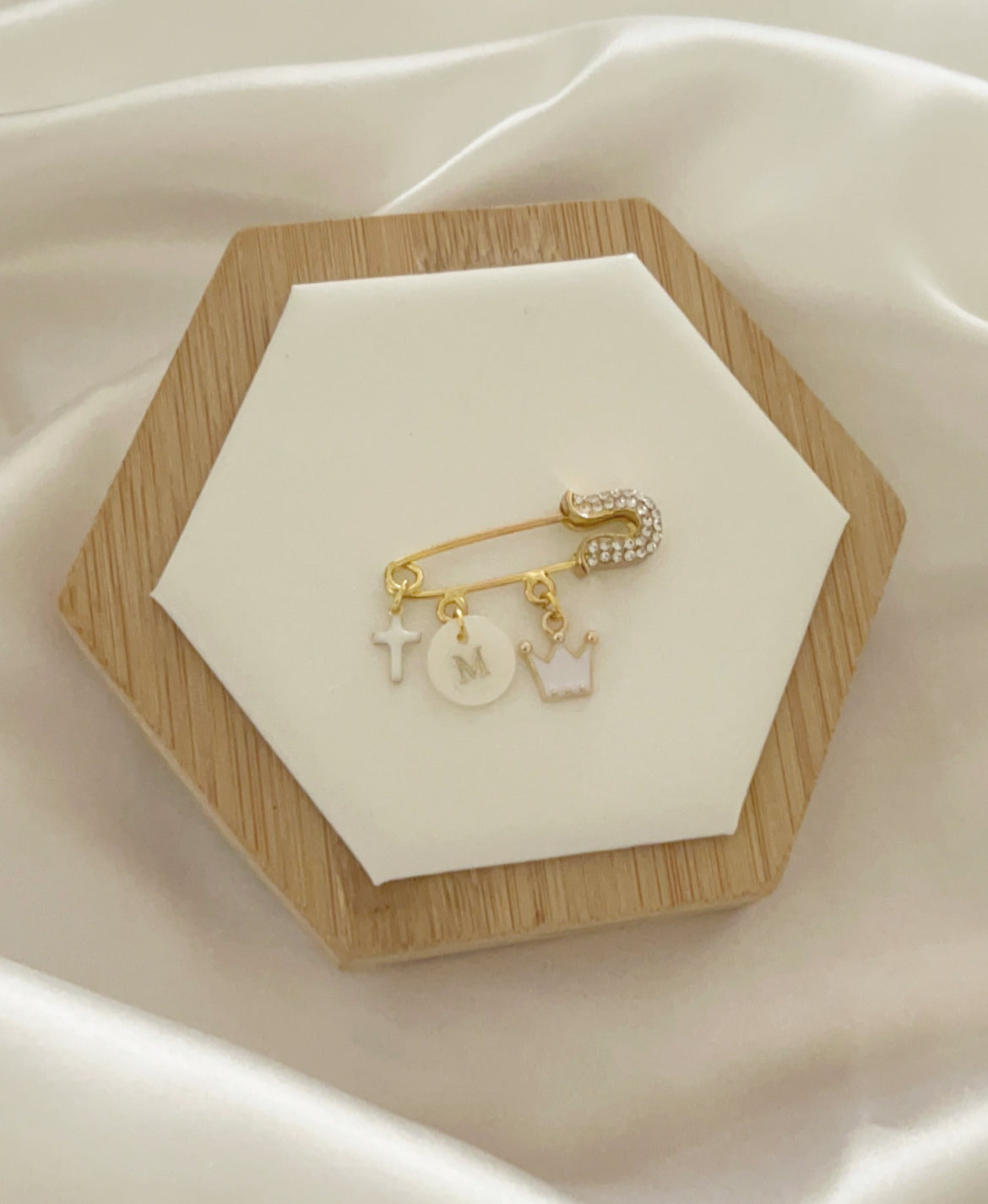 A luminous expression of faith and tenderness, Angelica Trésor is a gold-plated pin crafted with timeless elegance. This delicate piece features a soft rhinestone sparkle and three symbolic charms: a white crown representing purity and grace, a golden-stamped white shell for identity and tradition, and a dainty white heart — the universal symbol of love.