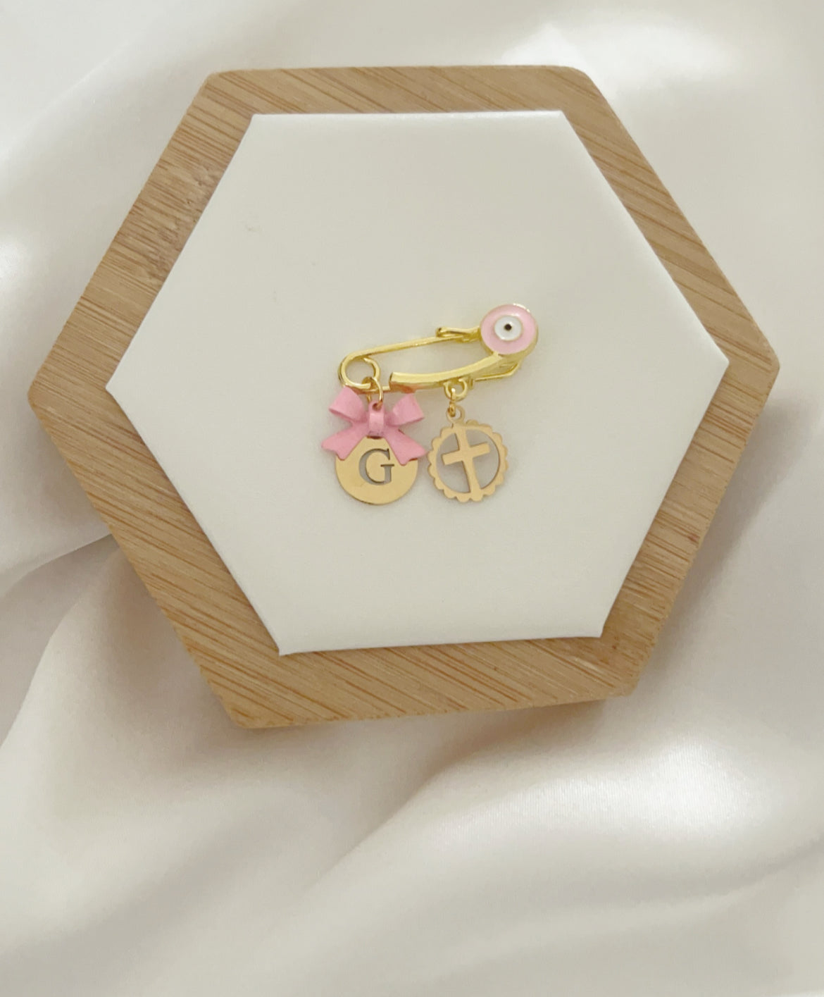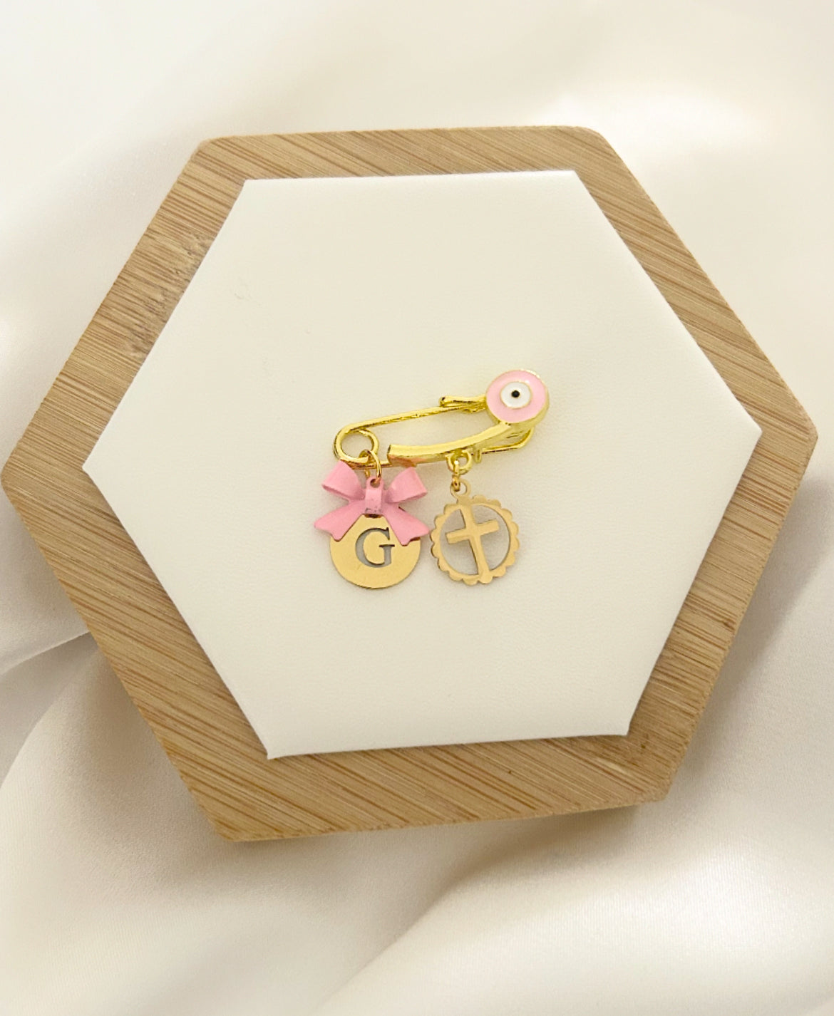 Plated in radiant gold, this delicate pin features a gentle pink evil eye for spiritual protection, along with two feminine charms: a pastel pink bow representing purity and divine love, and a personalized baby initial to mark her presence with grace.