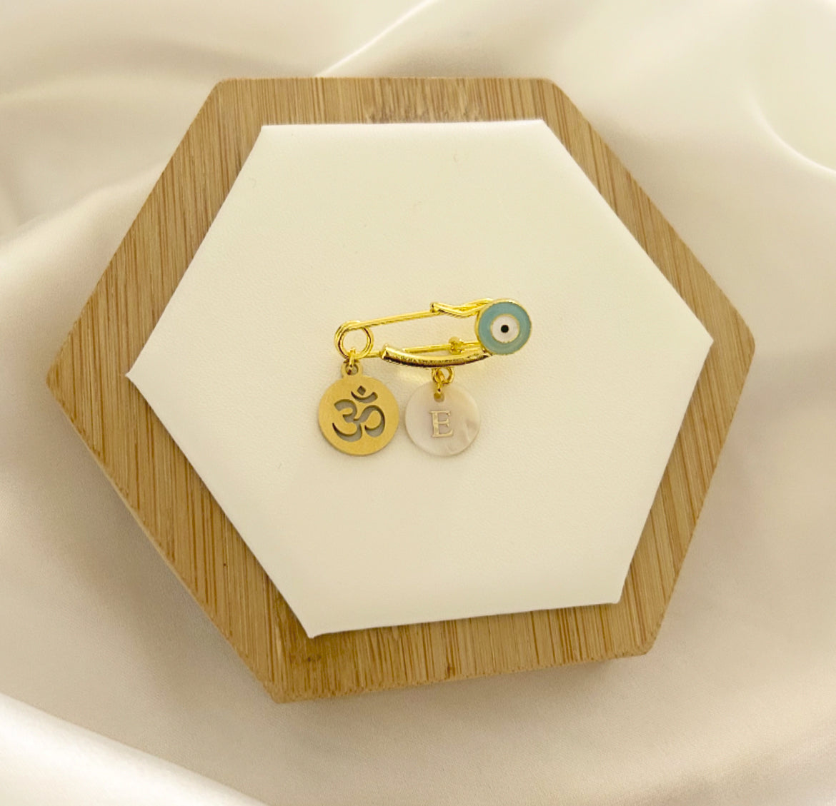 A radiant blend of tradition and protection, the Golden Mantra pin is a gold-plated keepsake designed to carry meaning beyond its delicate size. At its center is the protective evil eye, believed to ward off negative energy, paired with two sacred charms: the timeless Om, symbolizing peace and spiritual balance, and a white shell stamped with a golden letter, offering a personalized blessing.