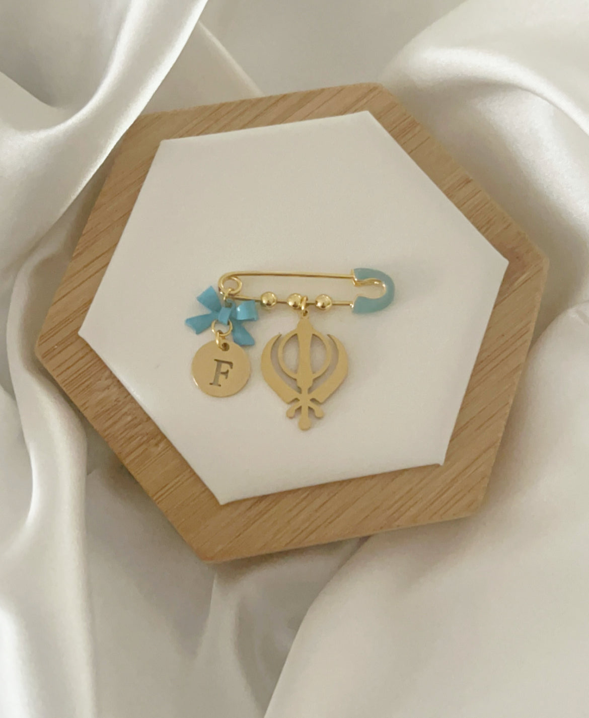 Delicate in design yet rich in meaning, the Gracelet is a refined keepsake made to honor both tradition and new beginnings. This tiny gold-plated brooch features the sacred Khanda Sikh symbol, gently complemented by a soft blue satin bow and a personalized baby initial charm—a tender tribute to the little one it adorns.