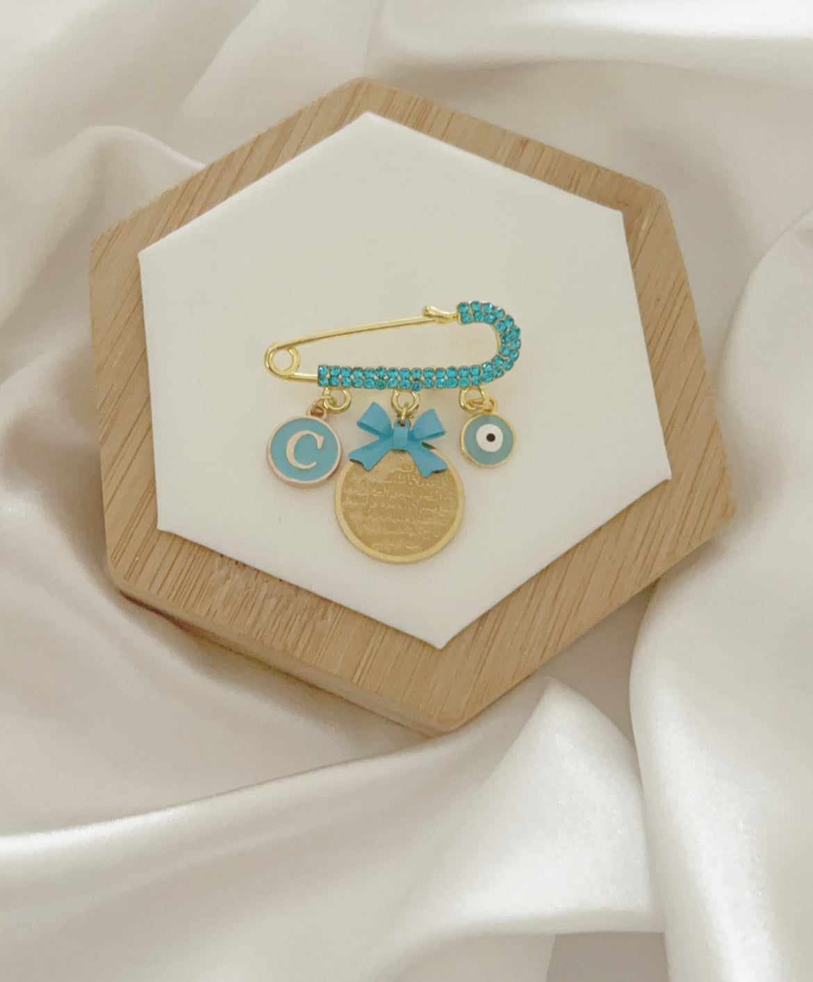It holds three symbolic charms: a protective evil eye, a graceful blue satin bow, and the sacred Ayatul Kursi charm, completed with a personalized baby initial in blue and gold—a heartfelt detail representing love and identity.