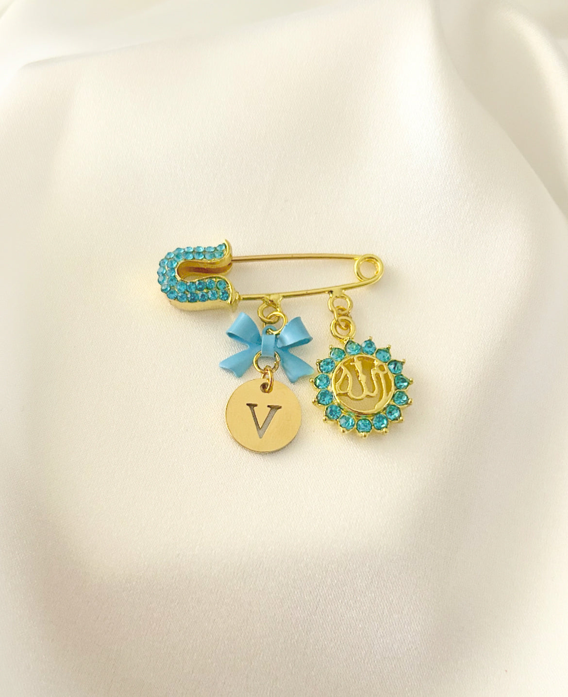 At its heart, a radiant gold charm graced with the holy name of Allah is encircled by serene blue enamel, softly representing divine protection and light. Beside it, a sweet blue satin bow, personalized with the baby’s initial, adds a tender and joyful touch — capturing both innocence and individuality.