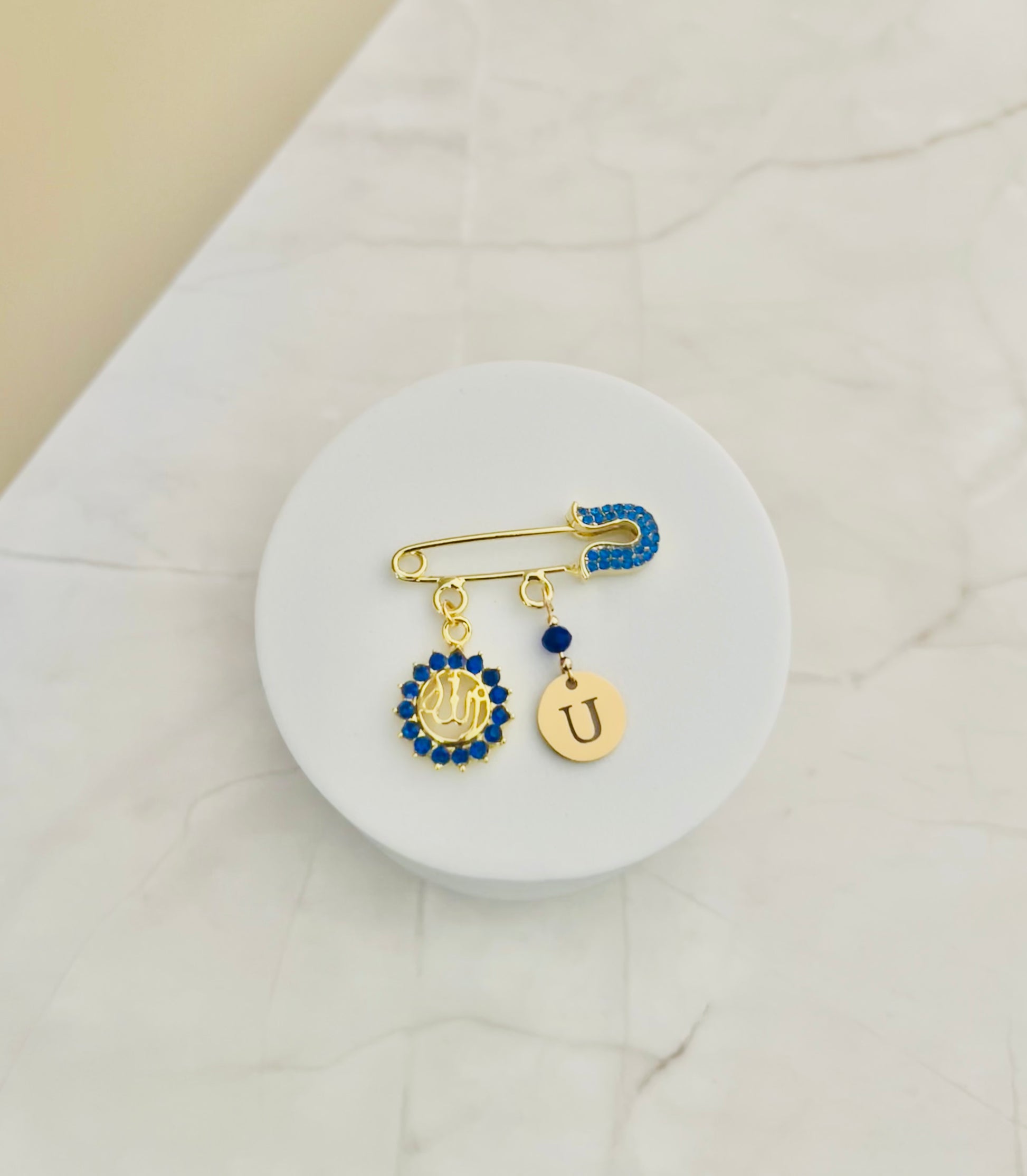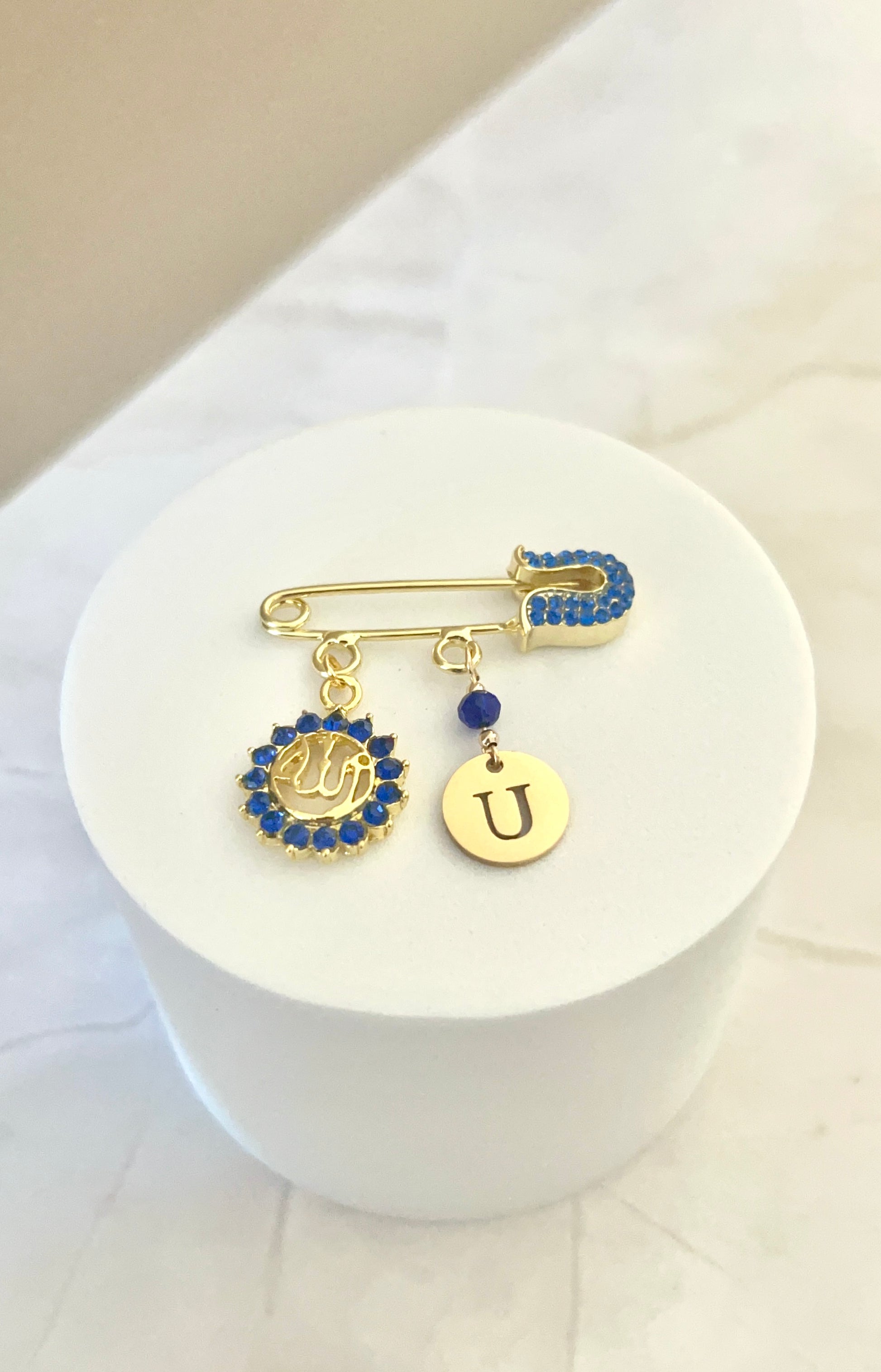 Elegant and radiant, the Siraj Blue pin is a gold-plated piece designed to capture the essence of light, faith, and timeless beauty. Accented with delicate royal blue rhinestones, this refined design features a finely detailed Allah charm encircled by shimmering stones, a matching blue bead, and a personalized baby initial that adds a meaningful, personal touch.