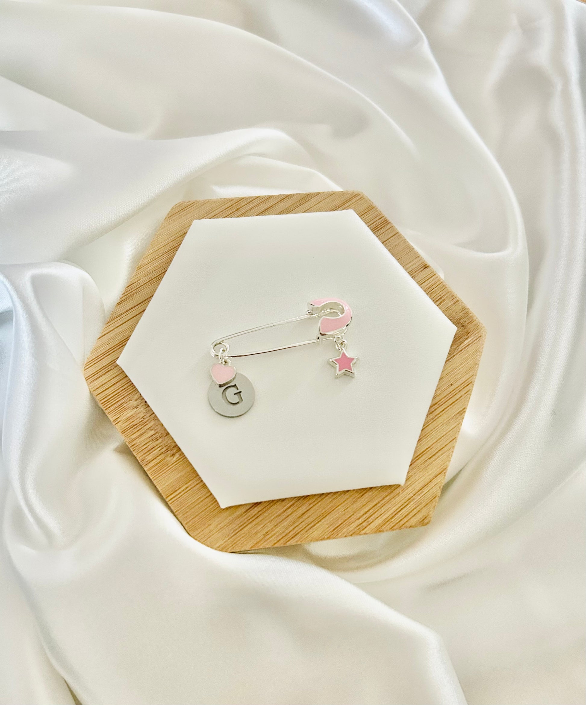 On one side, a tiny heart-shaped charm displays the baby’s initial in silver, hanging sweetly beneath it. On the opposite end, a charming pink star adds a whimsical, dreamy touch. Together, they create a beautifully balanced piece — subtle, elegant, and full of meaning.